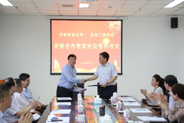 为深入实施吉林省高教强省战略,加强合作交流,推进协同创新,6月1日,吉林农业大学与吉林工商学院战略合作签约仪式在吉林工商学院综合办公楼702会议室举行。吉林工商学院党委书记王延吉、校长郭文君,我校党委书记席岫峰、校长冯江出席了签约仪式。仪式由吉林工商学院副院长王菁华主持。