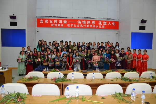 4月27日,学校妇委会在图书馆同声传译报告厅举办了吉农女性讲堂专场讲座,特邀《中国诗词大会》人气选手王天博、高级花卉园艺师刘春博作了主题为“诗情世界花意人生”的讲座。