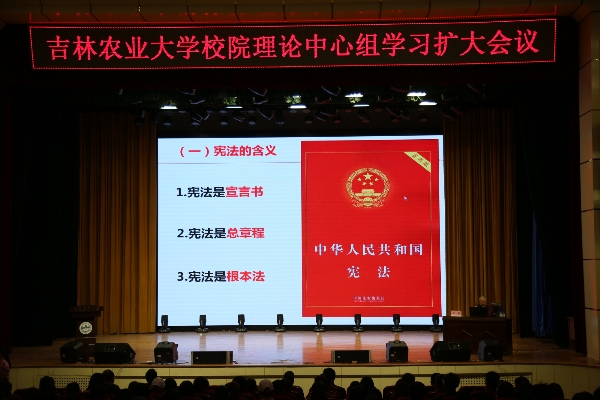 4月25日下午,学校在鲲鹏学生文化活动中心召开校院两级党委理论学习中心组学习扩大会议,专题学习《中华人民共和国宪法》。会议邀请吉林省委党校法学教研部主任傅大鹏教授,作了题为《维护宪法权威加强宪法实施》专题辅导报告。校领导席岫峰、冯江、王志中、毛彦军、刘景圣出席了会议。会议由校党委副书记徐文生主持。