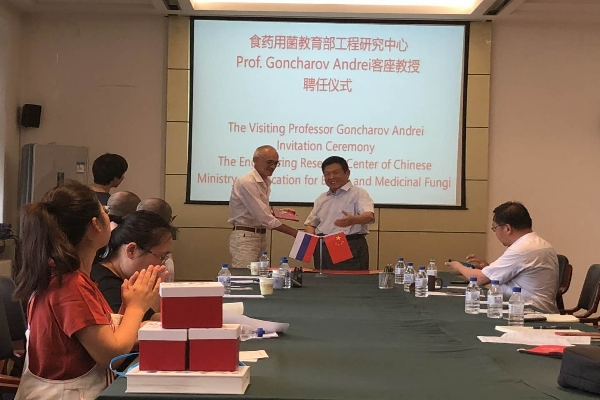 讨论会结束后,李玉向安德烈颁发了食药用菌教育部工程研究中心客座教授聘书。安德烈应邀作了题为《俄罗斯科学院远东分院联邦东亚陆地生物多样性科学中心的过去现在和未来》的主题报告。安德烈一行还与李玉院士团队成员赴长白山进行了菌物资源考察。