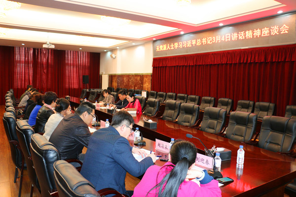 会上学习了习近平总书记3月4日在全国政协十二届五次会议联组会上发表的关于知识分子工作的重要讲话精神,我校13名无党派代表人士分别作了交流发言。