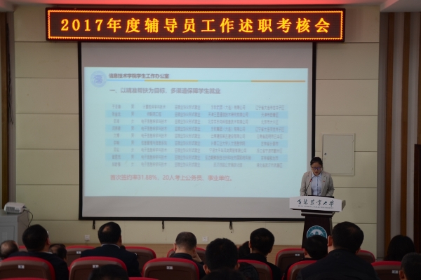 考核述职会上,全校47名辅导员围绕2017年工作开展情况、工作完成情况、个人成长情况、特色工作等方面,进行了工作述职。与会评委根据辅导员述职情况等进行了现场评分。