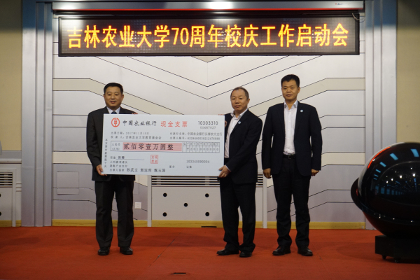 校长助理、校教育基金会理事长曲政文代表学校,接受孙武文,郭运库,93届动物营养专业本科毕业生、博瑞农牧集团副总裁甄玉国等3名校友捐赠的校友基金201万元,并向捐赠人颁发捐赠证书。
