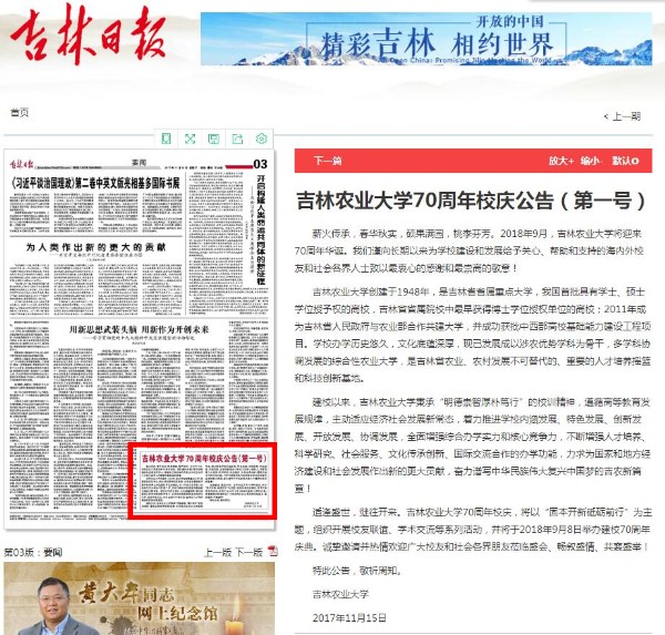 11月15日,吉林日报刊登了《吉林农业大学70周年校庆公告(第一号)》。