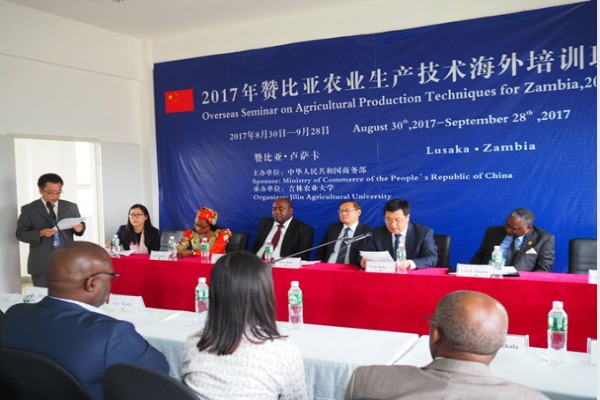 9月29日,由中国商务部主办,我校承办的2017年赞比亚农业生产技术海外培训班结业仪式在赞比亚首都卢萨卡市成功举行。中国驻赞比亚使馆政务参赞陈世杰、赞比亚畜牧渔业部代表奇布韦·考马司长、赞比亚大学校长卢克·蒙巴、吉林农业大学校长冯江以及来自赞比亚全国各地的32名参训学员参加了结业仪式。