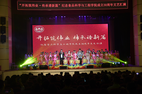 下午16时,与会领导专家、各届校友和学院师生在鲲鹏学生文化活动中心共同观看了“开拓筑伟业传承谱新篇”纪念食品科学与工程学院成立三十周年文艺汇演。原吉林农业大学副校长、食品科学与工程学院首任院长胡耀辉教授带领大家回忆了学院的成长历程,教师代表带来的诗朗诵《光荣与梦想》将晚会推向高潮,伴随着舞蹈《不忘初心》,晚会落下帷幕。