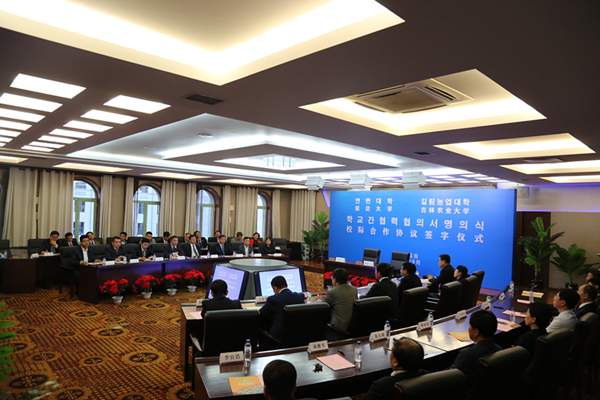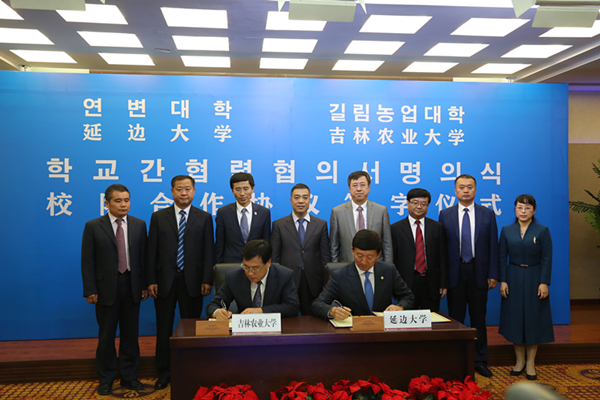 9月14日,我校党委书记席岫峰、校长冯江、副校长张越杰一行22人访问延边大学,并与延边大学签订校际合作协议。下午,吉林农业大学与延边大学校际合作协议签约仪式在延边大学办公楼四楼会议室举行。延边大学党委书记金雄、副校长张寿、陈铁、王延明出席仪式。仪式由陈铁主持。