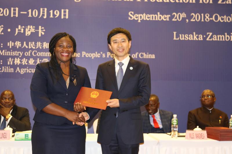 10月19日,代表团参加了由中国商务部主办、我校承办的2018年赞比亚农业生产海外研修班结业典礼。中国驻赞比亚大使馆政务参赞赖波、我校副校长张越杰、赞比亚内阁副常秘维尔利斯·曼古梅拉、赞比亚渔业和畜牧部计划司司长考斯莫·姆万加、赞比亚农业部农业司司长彼得·伦古、卢克·蒙巴、赞比亚农业研究院高级主管霍华德·坦布等分别代表中赞两国政府和相关单位致辞。赖波、张越杰和卢克·蒙巴分别向来自赞比亚全国各地的政府官员、农业技术推广人员、农场主和农民等85名学员颁发了结业证书。结业典礼结束后,全体参训学员向我校建校70周年赠送了礼物。赞比亚每日邮报、非洲华侨周报对研修班结业典礼作了专题报道。访赞期间,张越杰代表学校党委慰问了长期在赞比亚农业技术示范中心的工作人员,听取了中心包和平副主任的工作汇报,他对示范中心近期工作给予肯定,就中心如何更好地开展工作进行了研讨,并对中心干部职工提出了要求。