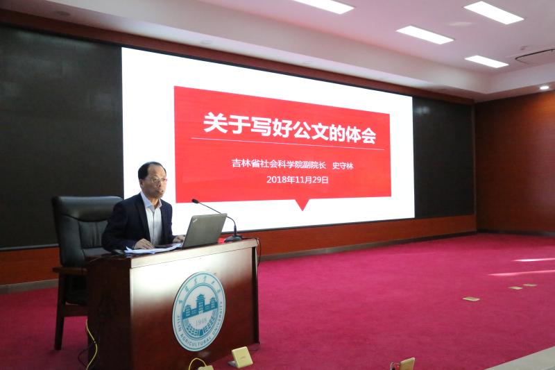 为进一步强化公文写作规范,推动行政文化建设,促进党建工作与业务工作紧密结合,11月29日下午,学校办公室党支部在中心教学楼一楼报告厅开展公文写作业务培训“最佳党日”活动。活动邀请了吉林省社会科学院党组成员、副院长史守林来校做辅导讲座,学校办公室才源同志结合本职工作进行了交流分享。活动由党委常委、学校办公室主任黄海主持。