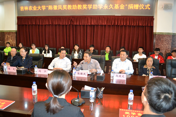 仪式上,冯江代表学校授予陈徽凤“吉林农业大学杰出校友”证书并作了讲话。冯江代表学校对陈徽凤表示了真挚的感谢和崇高的敬意,他指出,陈徽凤老师这次回到学校,向学校捐赠102.8万元建立永久基金,是学校办学历史上首次接受退休职工捐赠。陈徽凤老师捐资助学的高尚美德,为师生树立了学习榜样,又为我校增添了一笔宝贵的精神财富。当前,我校正处在全面改革发展的关键时期,需要许许多多像陈徽凤老师这样热爱学校的深情厚谊,需要像陈徽凤老师这样“达则兼济天下”的博爱情怀。“爱校”——这是学校精神文明的主题,我们要珍惜陈老师的大爱善举,将陈老师对学校、对师生的爱,传承下去,发扬光大。希望受到奖助的师生,不忘陈老师的恩情,将陈老师的关心关爱转化为人生与事业发展的强大动力,为学校实现内涵发展、特色发展、创新发展、开放发展、协调发展做贡献!