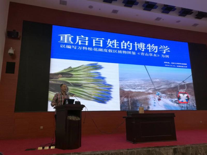 2018年12月12日在图书馆B座同声传译国际报告厅,学校图书馆邀请北京大学哲学系教授刘华杰博士来校讲学,主题是重启百姓的博物学,以他的著作《草木青山》为核心做了一个半小时的精彩纷呈的报告。教育引导了我校大学生做事要循序渐进,善于积累和运用工具书学习,报告使在场听众深入了解了博物学的意义。会后,刘华杰教授向图书馆赠予由本人编写的两本《青山草木》著作,图书馆负责同志向刘华杰教授颁发了图书馆收藏证书。
