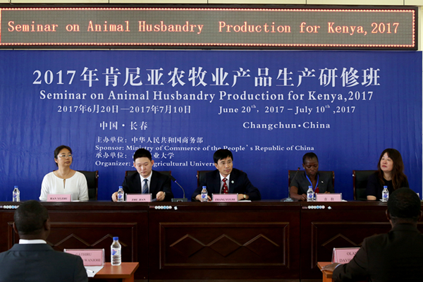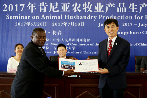 7月10号,由国家商务部主办,我校承办的2017年肯尼亚农牧业产品生产研修班结业典礼在理科楼报告厅举行。副校长张越杰,吉林省商务厅对外投资和经济合作处朱健,授课教师代表及国际合作与交流处相关人员出席了结业典礼。