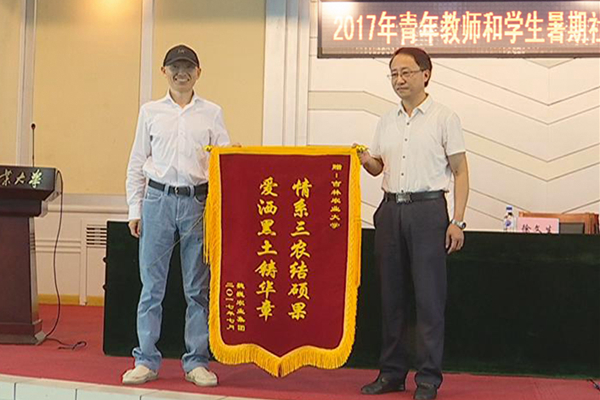 会上,播放了《2016年暑期“三下乡”社会实践活动回顾短片》;校团委书记彭雨石对暑期社会实践活动总体安排进行了介绍;学院党委书记代表信息技术学院党委书记王志江、优秀指导教师代表资源与环境学院副院长杨靖民、校企共建代表吉林省魏巍农业科学研究院院长魏巍、重点团队学生代表生命科学学院王佳琦分别作了发言。徐文生代表学校接受吉林省魏巍农业科学研究院向学校馈赠的锦旗;张弘、吴波为吉林农业大学大学生特色理论践行社会徽揭牌;参会大学生志愿者集体宣誓;与会领导为重点团队代表授旗。