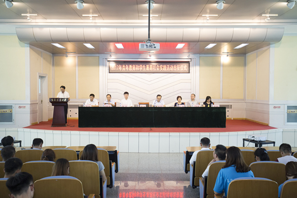 ,学校在中心教学楼报告厅隆重举行“喜迎十九大•青春建新功”青年教师和学生暑期社会实践活动出征仪式。共青团吉林省委学校部部长张弘,校党委副书记徐文生,校关工委常务副主任吴波出席了仪式。仪式由党委副书记毛彦军主持。