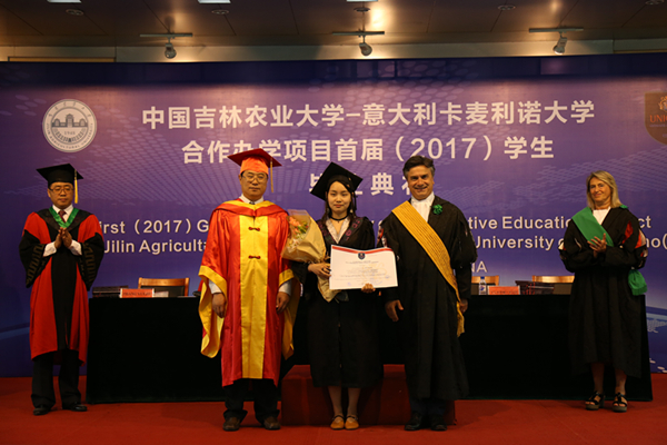 我校中意合作办学项目于2012年6月获得中国教育部批准,2013年首次招生,今年首届毕业生52人,有50人顺利毕业获得吉林农业大学学士学位证书,其中14人达到卡麦利诺大学授予学位标准,获得卡麦利诺大学学士学位证书。