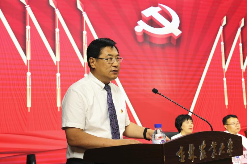 党委书记席岫峰发表讲话,他代表学校党委,向辛勤工作在学校教学、科研、管理、服务等岗位上的教职工党员,向曾经为学校建设和发展作出贡献的离退休老党员,向励志勤学、勇敢追梦的青年学生党员致以诚挚的问候和崇高的敬意!
