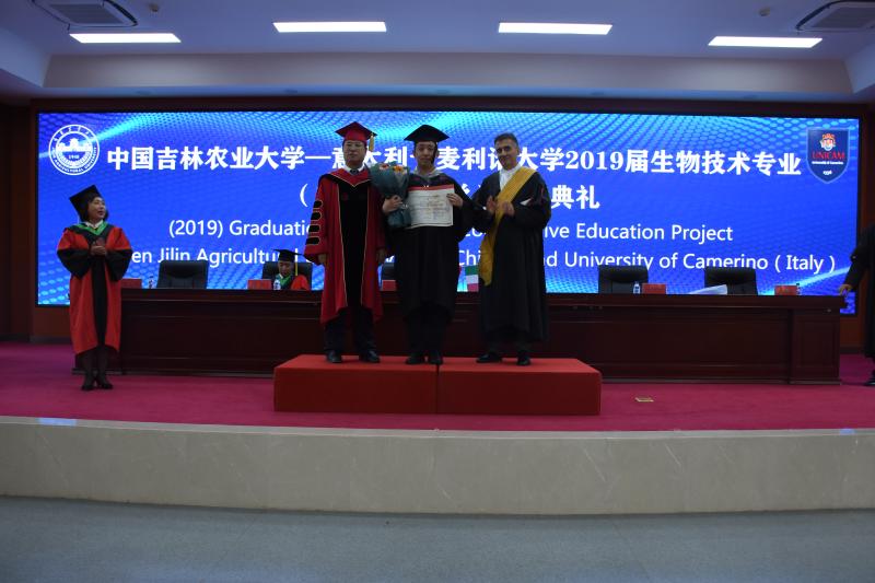 6月25日,中国吉林农业大学——意大利卡麦利诺大学2019届生物技术专业(中意合作办学)毕业典礼在中心教学楼一楼报告厅举行。卡麦利诺大学副校长格拉齐亚诺•雷奥尼,卡麦利诺大学校长助理雷纳多•德•雷奥尼,我校校长冯江,出席毕业典礼。毕业典礼由副校长张越杰主持。