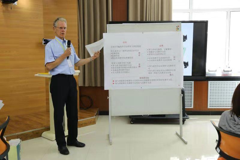 研修班在前期需求调查的基础上,了解参与教师的学科背景、教学目标及教学方法使用情况进行课程设计;通过深度体验式行动,帮助学员感受教师主导式、学生主导式、师生参与式不同教学策略的区别;Jon Daane博士从具体经验、反思性观察、抽象概念化、积极实验四个方面为教师提供上至理念、下至教学方法、考核评价方法等一系列系统化的教学策略和框架,帮助教师组建学生团队、平衡团队冲突、保证团队任务完成,导向高阶教学能力,成功将学生卷入课堂。同时学员就自身的教学实践、教学过程中采取的参与式教学经验、目前存在的困惑进行深刻反思。