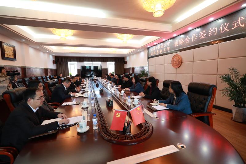 11月22日上午,我校与吉林外国语大学战略合作框架协议签约仪式在主楼中四楼会议室举行。吉林外国语大学校长秦和、党委书记杨福民,我校党委书记席岫峰、校长冯江共同出席了签约仪式。冯江、秦和分别代表吉林农业大学和吉林外国语大学签署了战略合作框架协议。