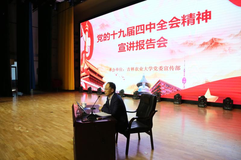 为深入学习宣传贯彻党的十九届四中全会精神,12月4日,学校在鲲鹏学生文化活动中心举办了党的十九届四中全会精神宣讲报告会。报告会邀请省委宣讲团成员,吉林省社会科学院副院长史守林教授作了题为《学习党的十九届四中全会精神》的宣讲报告。学校领导班子成员出席报告会。报告会由校党委副书记徐文生主持。
