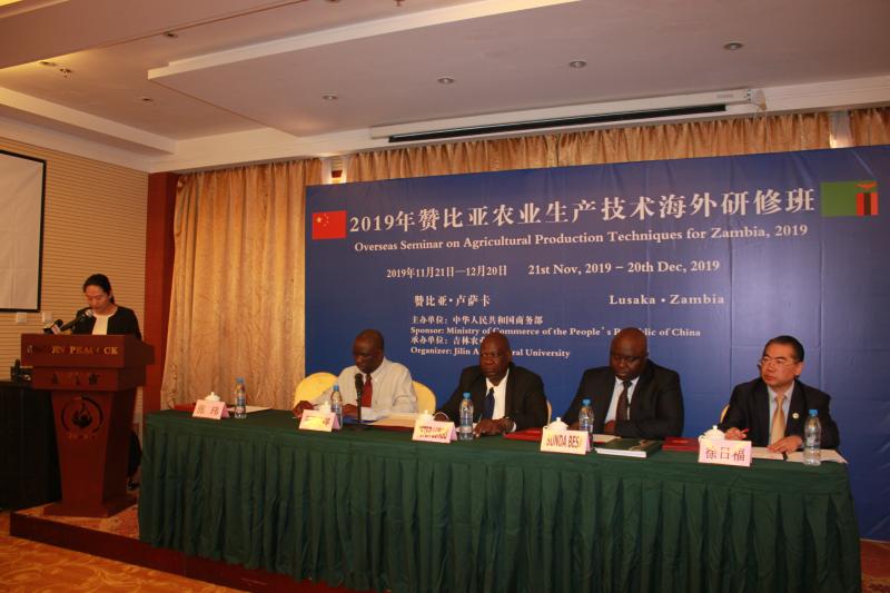 12月19日,由商务部主办,我校承办的2019年赞比亚农业生产技术海外研修班结业典礼在赞比亚首都卢萨卡举行。赞比亚农业部农业司司长彼得·伦古、畜牧渔业部畜牧主管文森特·西蒙维,中国驻赞比亚大使馆经济商务处三等秘书张玮及部分驻赞比亚中资农业企业代表出席典礼。