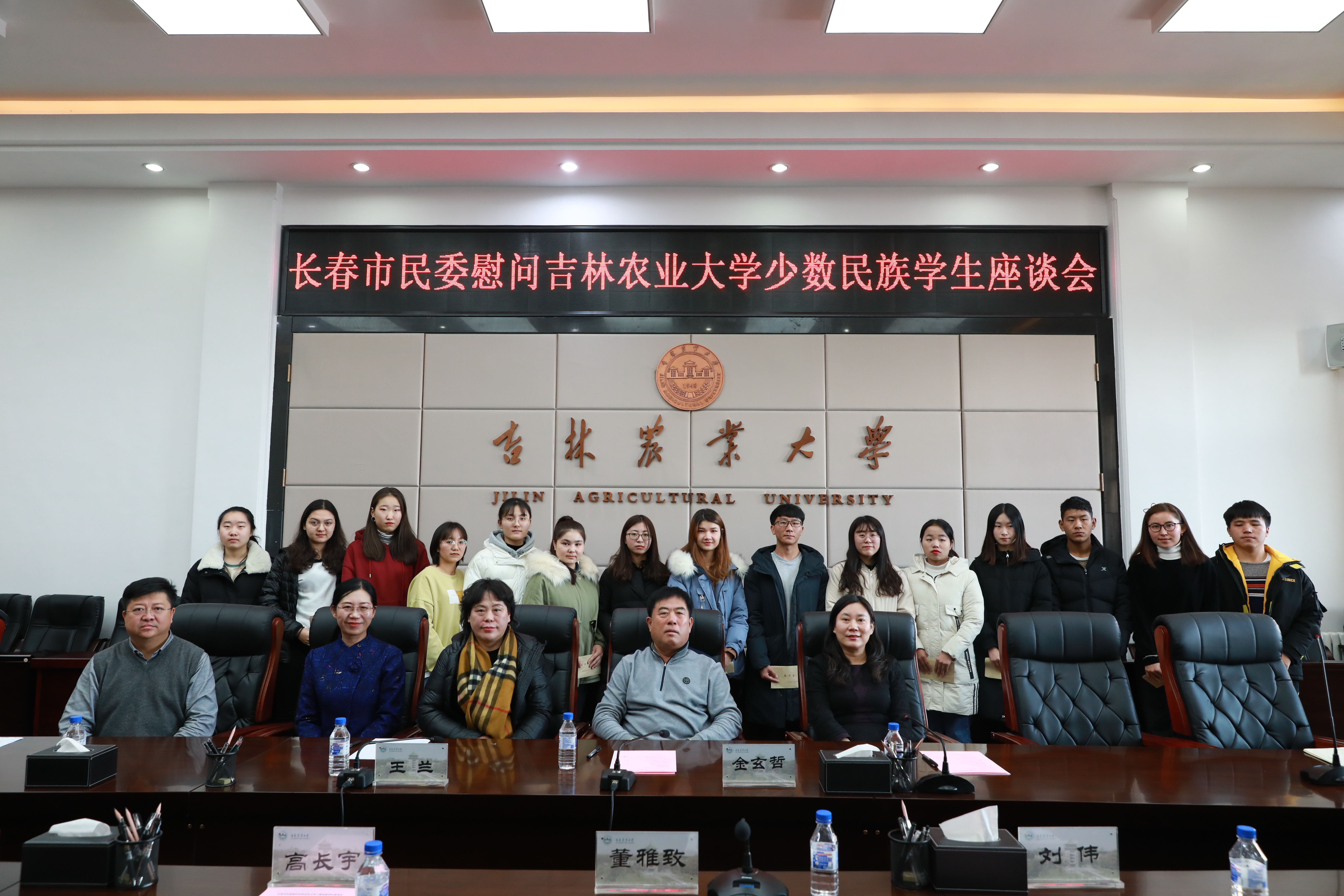 为进一步关心我校少数民族学生的学习、生活,不断强化学校“三全育人”的针对性与实效性,增强少数民族学生的归属感、获得感、成就感和幸福感,12月31日上午,学校在主楼中五楼会议室召开长春市民委慰问我校少数民族学生座谈会。长春市民委政法处处长金玄哲、调研员王兰出席座谈会。