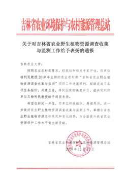 12月18日,我校中药材学院国家中药材产业技术体系岗位科学家杨利民教授主持完成的农业农村部“吉林省农业野生植物资源调查收集与监测”项目通过农业农村部农业生态与资源保护总站组织的项目验收。该项目组优质超额完成了任务书规定的各项指标,成绩显著,得到农业农村部农业生态与资源保护总站和吉林省农业环境保护与农村能源管理总站的通报表扬。