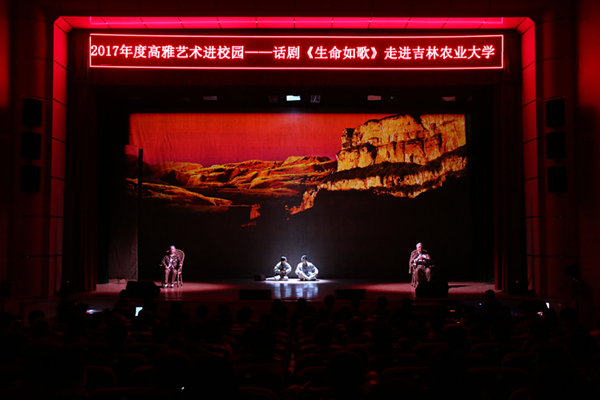 为贯彻落实《中共中央关于繁荣发展社会主义文艺的意见》和《国务院办公厅关于全面加强和改进学校美育工作的意见》,实现“立德树人”根本任务,提高我校青年学生的人文素养,4月26日晚,中国梦和“一带一路”主题作品,山西省话剧院大型原创话剧《生命如歌》在学校鲲鹏学生文化活动中心上演。本场演出是教育部、文化部、财政部联合举办的2017年“走近大师,感受经典,陶冶情操,提高修养”高雅艺术进校园活动之一。学校党委书记席岫峰,副校长陈光、党委副书记毛彦军、副校长刘景圣与千名师生共同观看了本场演出。