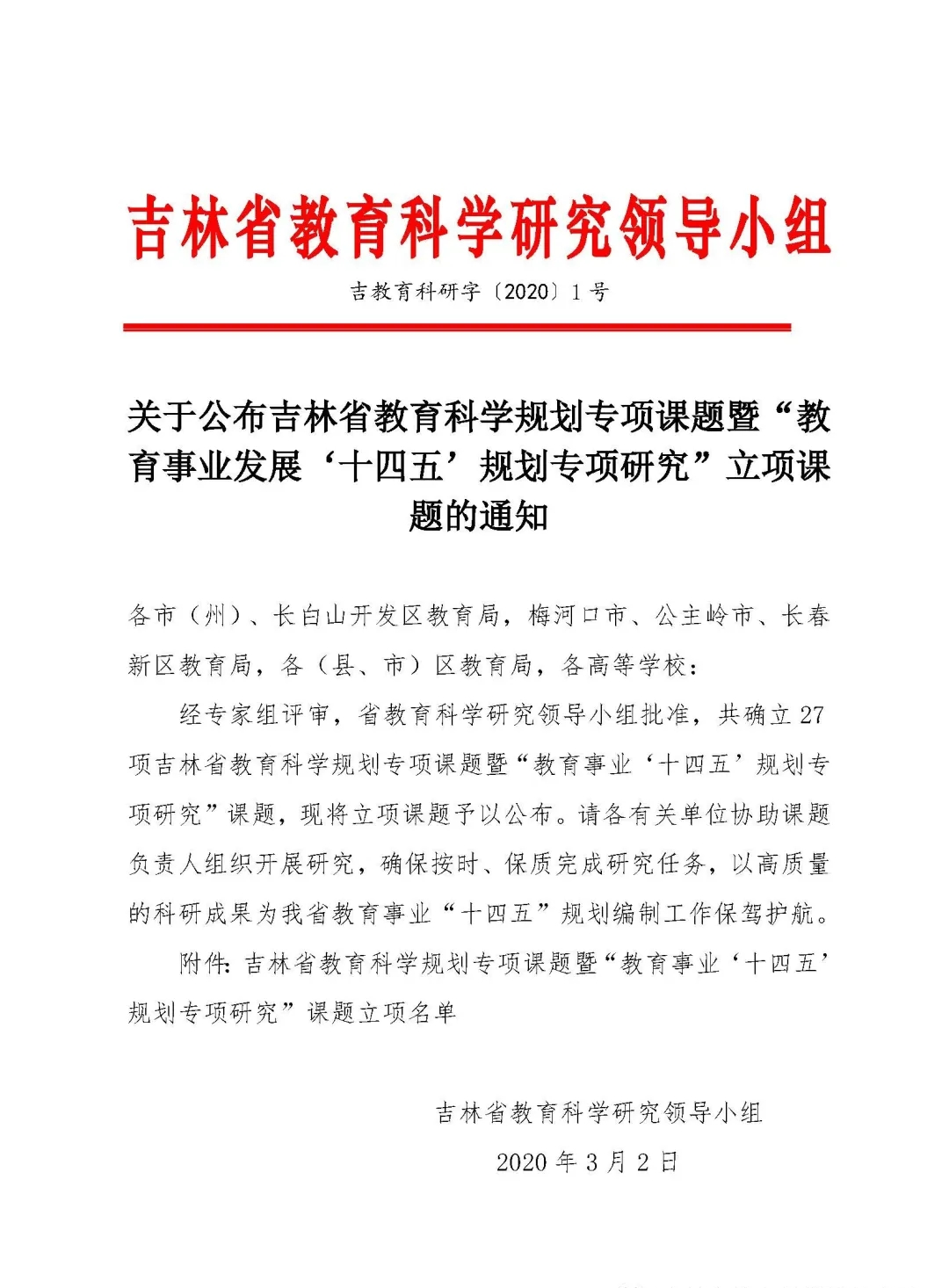 日前,吉林省教育科学研究领导小组发布了《关于公布吉林省教育科学规划专项课题暨“教育事业发展‘十四五’规划专项研究”立项课题的通知》,我校校长冯江作为负责人的《“十四五”时期吉林省高等学校分类管理若干问题研究》课题获批立项。
