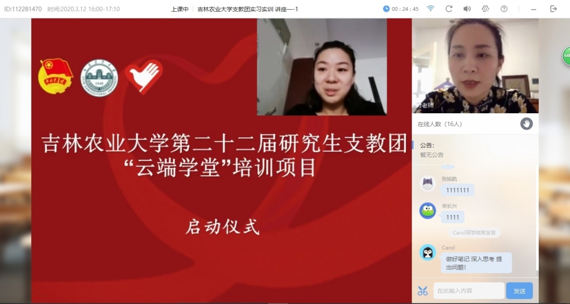 在新冠肺炎疫情爆发的特殊时期,吉林农业大学第22届研究生支教团实习实训工作受到严峻考验。为认真贯彻落实团中央《关于组建中国青年志愿者扶贫接力计划第22届研究生支教团(2020—2021年度)有关工作安排的通知》文件精神,有效破解工作瓶颈,并进一步增强研究生支教团的使命意识和奉献精神,提升职业道德和教学能力,提高服务质量和志愿成效,学校研究生支教团项目办探索谋划,创新实施吉林农业大学研究生支教团“云端学堂”培训项目。