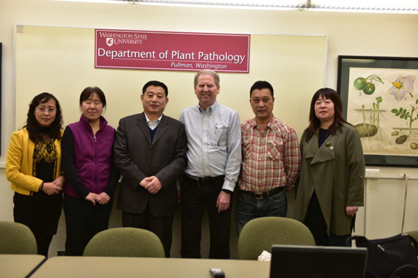 在美国华盛顿州立大学,代表团成员与华盛顿州立大学副校长首席执行官、国际事务扩展与友好部主任等相关负责人进行了深入会谈,就两校农业相关领域联合开展学生互换、师资培训、科研合作等方面进行了交流,双方围绕派遣中、长期专业教师访学,农业相关专业本科学生联合培养,互派研究生等内容签定了合作备忘录。代表团还与该校植物病理学科进行了对接,受到了美国植物病理学会主席、华盛顿州立大学植物病理学院院长Timothy D. Murray博士及其团队的热情接待,双方就今后开展合作达成初步意向,就联合培养研究生达成了初步协议。访问期间,与在该校工作的我校优秀校友张志武博士、沈宏艳博士等进行了亲切交流。