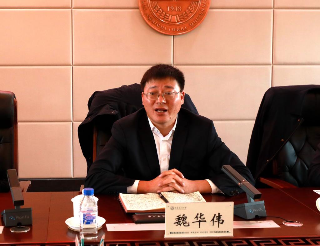 冯江在致辞中代表学校对魏华伟一行表示欢迎,并介绍了学校的基本情况,特别是在社会服务方面的做法和经验。他表示:长期以来,学校主动承担农业高校的责任和使命,充分发挥农业高校自身科教优势,动员全校师生投身到乡村振兴的广阔天地中,不断为服务国家及区域经济建设和社会发展打造“吉农样本”,贡献吉农力量。学校和泌阳县有着长期良好的合作基础,李玉院士团队已经在泌阳县开展了一系列卓有成效的科技推广工作。今天的签约仪式标志着学校与泌阳县进入到全面合作的崭新阶段,学校将竭力为落实战略合作协议的各项内容提供必要支持。