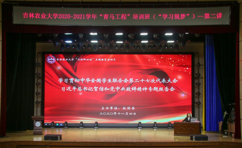 为深入学习贯彻宣传中华全国学生联合会第二十七次代表大会习近平总书记贺信和党中央致辞精神,团结带领我校青年学生坚定理想信念,培育高尚品格,练就过硬本领,11月4日,校团委在鲲鹏学生文化活动中心开展2020-2021学年“青马工程”培训班(“学习筑梦班”)第二期暨学习贯彻中华全国学生联合会第二十七次代表大会习近平总书记贺信和党中央致辞精神专题报告会。全国学联二十七大代表、我校农学院2017级赵杨赫同学作专题报告。