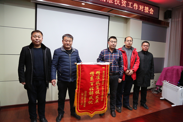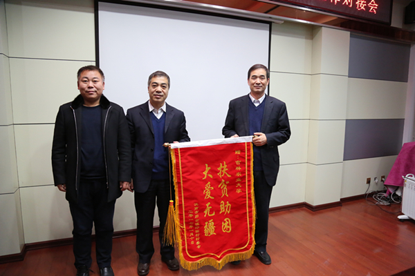 程德龙还代表那金镇党委、政府向学校递交了感谢信,并向学校赠送了“扶贫助困 大爱无疆”锦旗;姜旭波代表好田村村委会为学校扶贫办赠送了“精准扶贫促发展 情系百姓解民忧”锦旗。