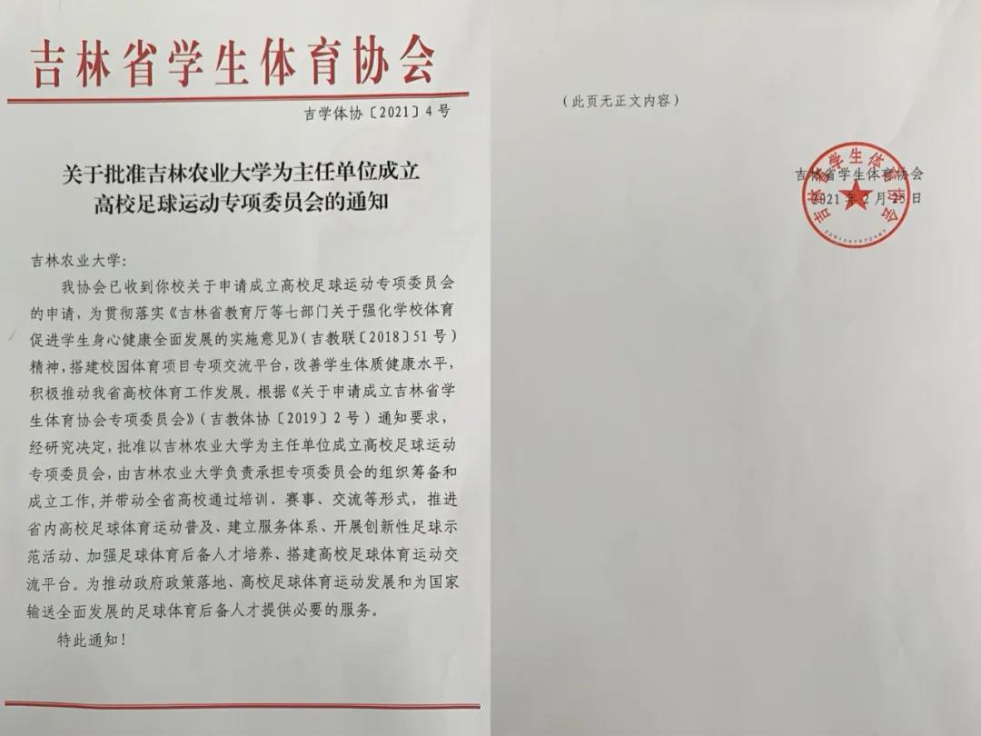 2月25日,吉林省学生体育协会根据《关于申请成立吉林省学生体育协会专项委员会》通知要求,经研究决定,批准以吉林农业大学为主任单位成立高校足球运动专项委员会,由吉林农业大学负责担任专项委员会的组织筹备和成立工作。