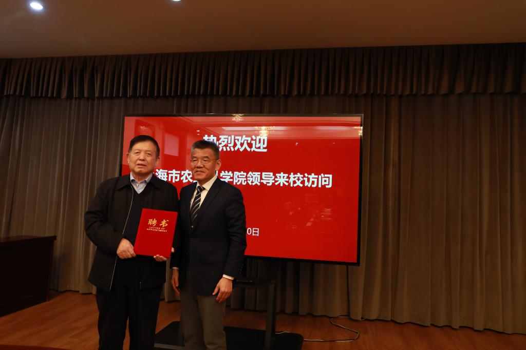 签约仪式上,冯江和蔡友铭分别代表学校和上海市农业科学院签署科研合作意向书;上海市农业科学院聘请李玉院士为上海市农业科学院食用菌研究所名誉所长,蔡友铭为李玉院士颁发聘书。