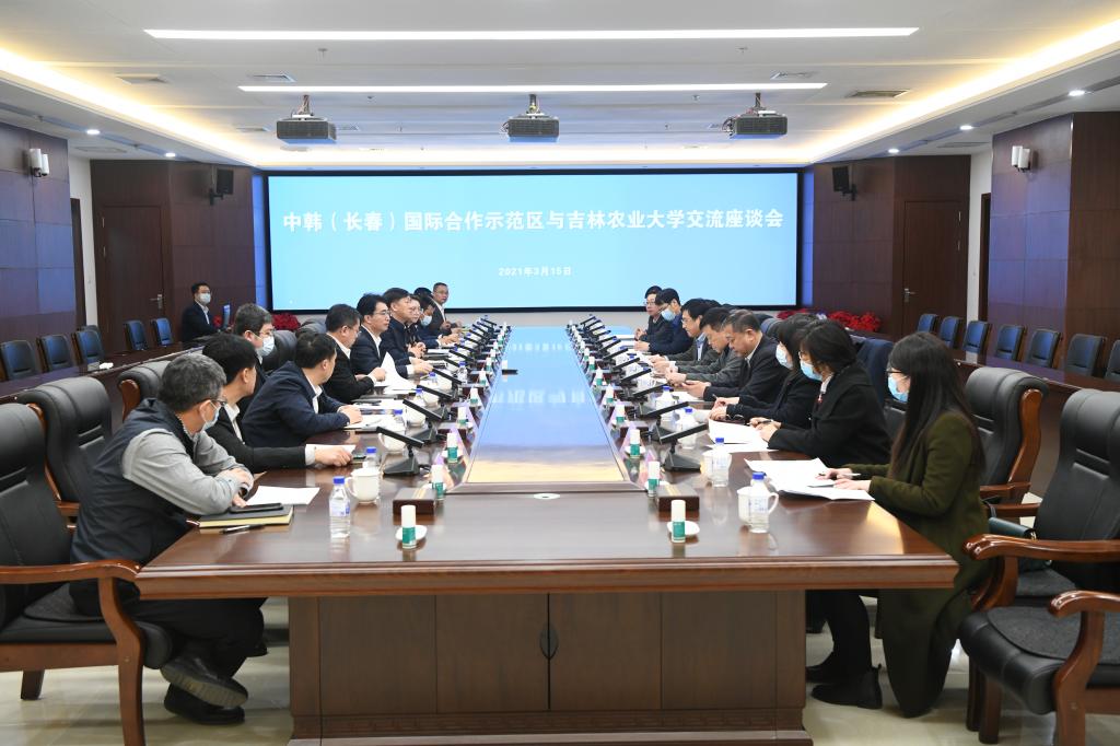 3月15日,吉林农业大学校长冯江到中韩(长春)国际合作示范区洽谈合作。长春市委常委、中韩(长春)国际合作示范区党工委书记高玉龙,中韩示范区建设领导小组办公室主任赵旭,中韩示范区党工委副书记李子臣,中国工程院院士、我校教授李玉,学校副校长杜锐参加了洽谈会议。