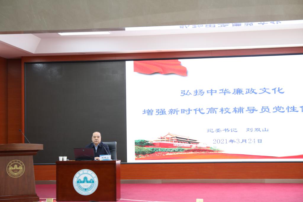 3月24日下午,学校在综合教学楼一楼报告厅召开了学生工作队伍第112期理论学习研讨会暨学生工作队伍“作风建设年”活动动员大会。会议由学校党委副书记毛彦军主持。校纪委书记刘双山作了《弘扬中华廉政文化 增强新时代高校辅导员党性修养》专题辅导。