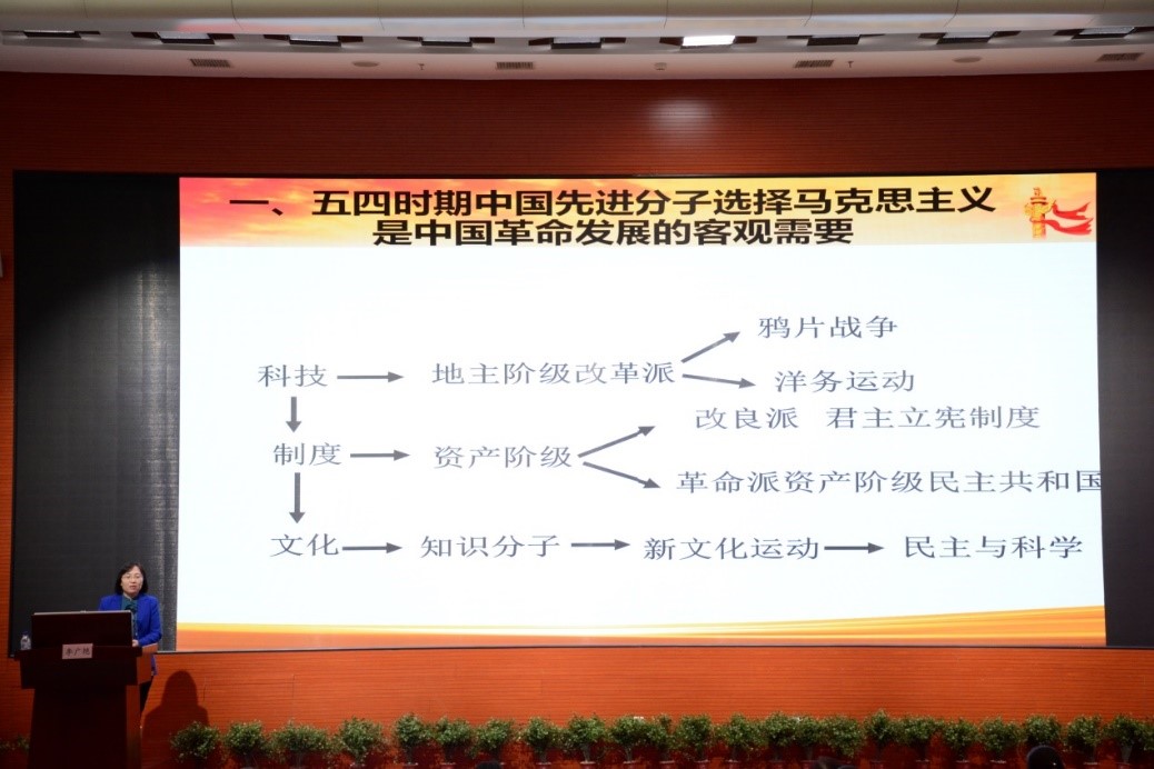 仪式结束后,马克思主义学院庆祝建党100周年系列活动之“学史明理”十五讲系列学术讲座拉开了帷幕。第一讲由马克思主义学院李广艳教授主讲。她以《马克思主义与中国》为题,从五四时期中国先进分子选择马克思主义是中国革命发展的客观需要、俄国十月革命后中国先进分子选择马克思主义是世界历史新时代的召唤、中国先进分子选择马克思主义是理性的科学的选择、中国先进分子选择马克思主义在于马克思主义的理论选择四个方面阐述了中国选择马克思主义的历史必然性。