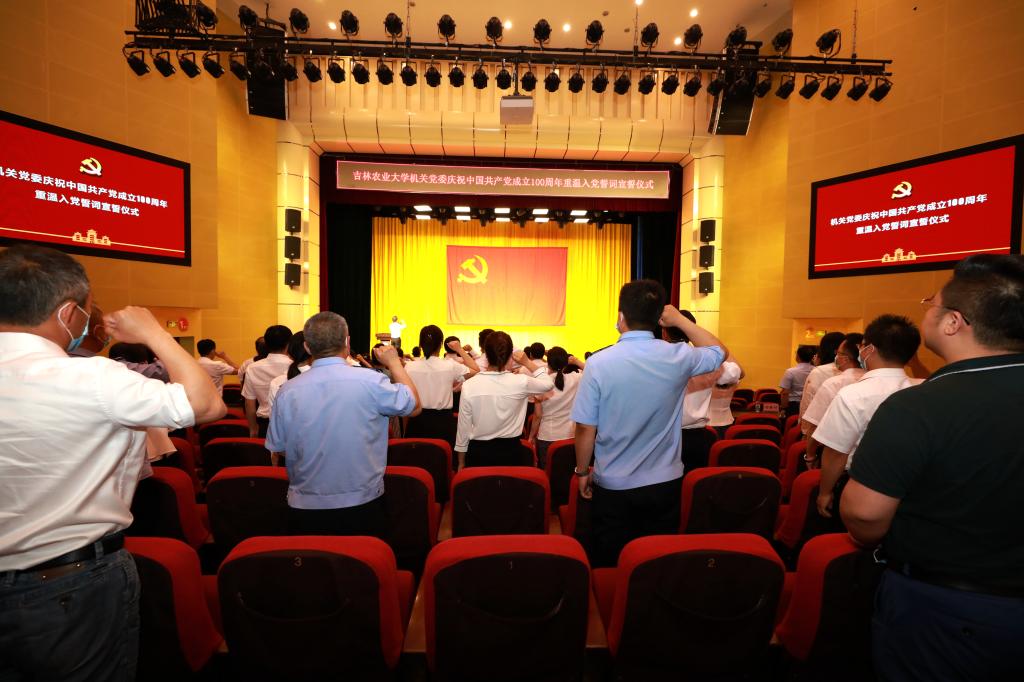 庆祝大会结束后,与会党员面对党旗,开展了重温入党誓词宣誓仪式,随后共同合唱了《没有共产党就没有新中国》。