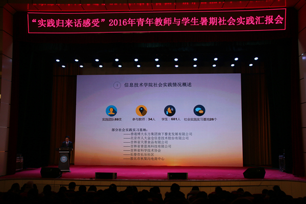 12月12日,学校在鲲鹏学生文化活动中心召开“实践归来话感受”2016年青年教师和学生暑期社会实践汇报会。团省委副书记牟大鹏;学校党委书记席岫峰,副校长张越杰、党委副书记徐文生、副校长李新、校纪委书记王志中、党委副书记毛彦军;长春市永兴街道党工委书记邹钟宏出席了活动。