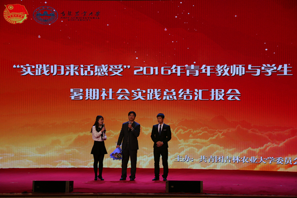 汇报会上,播放了《2016年大学生暑期社会实践工作总结短片》,再现了2016年565支社会实践团队的青春风采和315名教师率先垂范的育人风范。经济管理学院“经创飞扬”服务社会实践团刘思忆同学、资源与环境学院赴山东中农联合生物科技支农实践服务实践团刘爱同学等学生代表分享了实践感悟;农学院胡文河教授作为指导教师代表接受采访并作了讲话,信息技术学院副院长李健作为青年教师代表发言;邹钟宏、长春中邦园林股份有限公司副总经理温娜分别作为街道和企业代表发言。