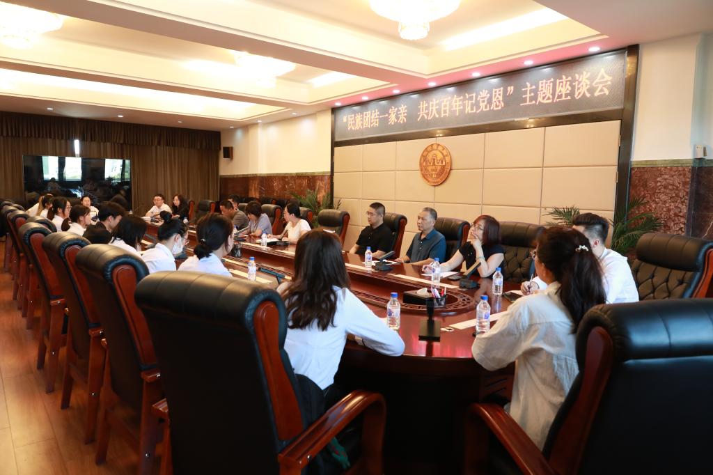 为全面落实学校作风建设年的工作要求,学习贯彻习近平总书记在庆祝中国共产党成立100周年大会上的重要讲话精神,加强与少数民族师生的沟通和交流,了解我校少数民族学生学习、生活情况,提升少数民族学生教育管理水平,7月2日,由党委组织部、党委统战部、党委学生工作部、校团委共同主办的主题为“民族团结一家亲 共庆百年记党恩”少数民族师生座谈会在行政楼中四楼会议室召开。