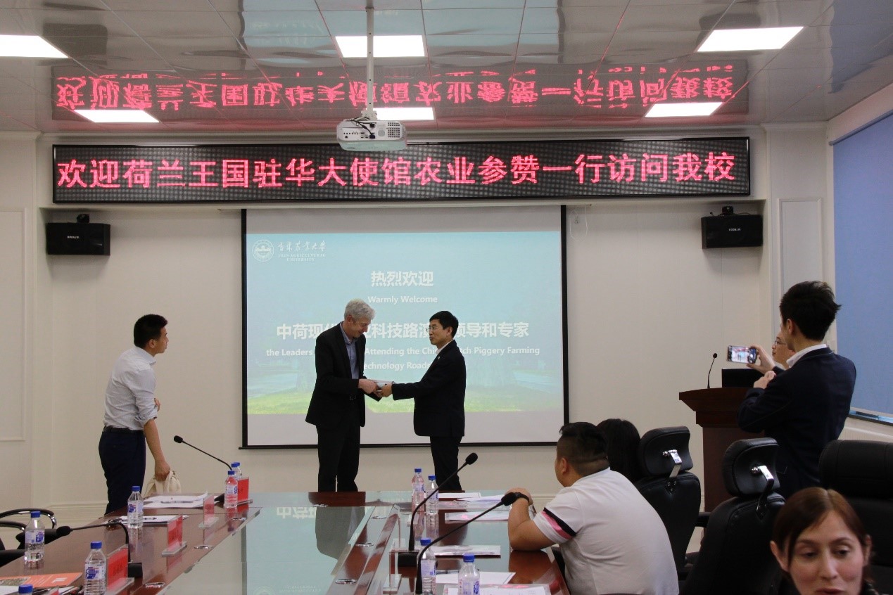 会上,副校长张越杰代表学校对荷兰王国驻华大使馆农业参赞一行表示欢迎并简要介绍了我校情况。他强调,吉林农业大学高度重视与荷兰高等院校在人才培养、国际科研等方面开展合作,希望通过此次科技交流,进一步增进双方了解,加深友谊,加强合作。教育部动物生产及产品质量安全重点实验室主任秦贵信教授介绍了重点实验室的情况,吉林省生猪产业技术科技创新中心主任姜海龙教授就吉林省生猪产业面临的问题和需求做了深入交流。与会的国内外生猪养殖企业代表也积极发言交流,中荷双方就生猪养殖的环境风险、疫病防范、节本降耗等问题展开了积极的讨论和交流。张越杰副校长与荷兰王国驻华使馆农业参赞武田富代表双方互赠了礼品。会议结束后,中荷现代猪业科技路演一行人员参观了动物生产及产品质量安全教育部重点实验室。