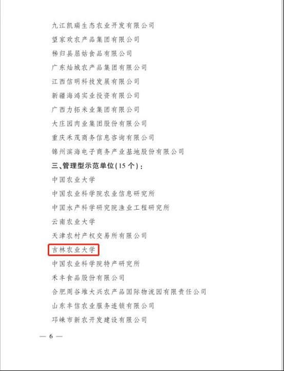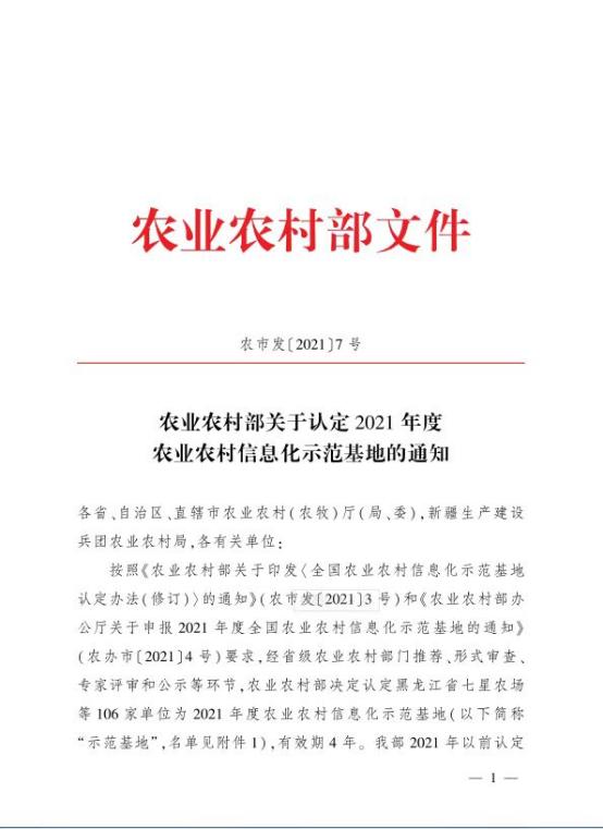 9月26日,农业农村部发布《关于认定2021年度农业农村信息化示范基地的通知》,认定吉林农业大学为农业农村部2021年度农业农村信息化示范基地(管理型示范单位)。此次认定了生产型、经营型、管理型和服务型全国共106家单位为基地为农业农村信息化示范基地。其中,吉林省共有3个基地入选,全国共有中国农业大学等4所农业高校入选。