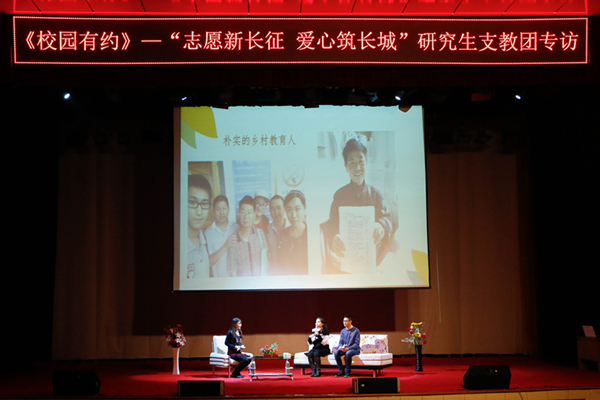 11月30日,学校在鲲鹏学生文化活动中心举办了《校园有约》——“志愿新长征,爱心筑长城”第十七届研究生支教团专访活动。副校长陈光,校纪委书记王志中,校党委副书记毛彦军参加了本次活动。