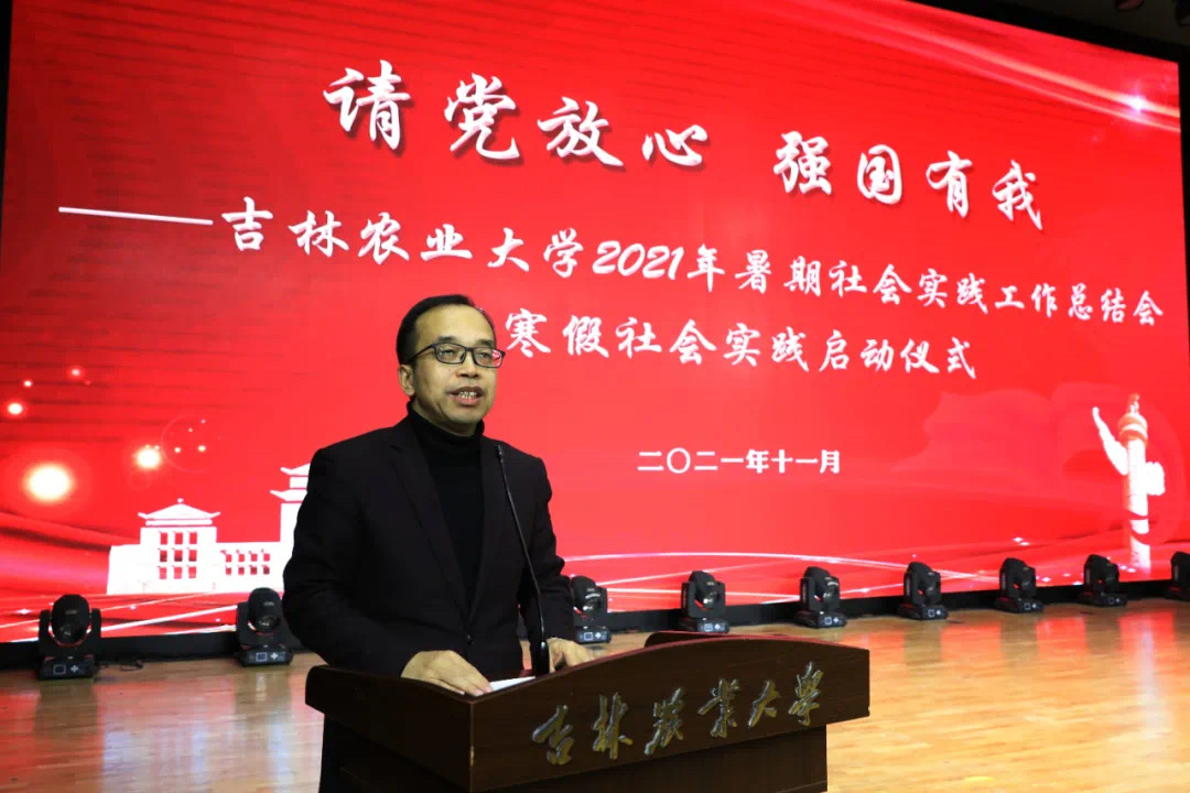 在中国共产党成立百年之际,为引导和帮助广大青年学生上好与现实相结合的“大思政课”,在社会课堂中受教育、长才干、作贡献,在观察实践中学党史、强信念、跟党走,11月25日,学校在鲲鹏学生文化活动中心举行“请党放心,强国有我”2021年大学生暑期社会实践工作总结会暨寒假社会实践启动仪式。吉林省农业宣传中心主任、吉林乡村振兴战略研究院执行副院长孙策,学校党委副书记毛彦军、副校长杜锐出席活动。