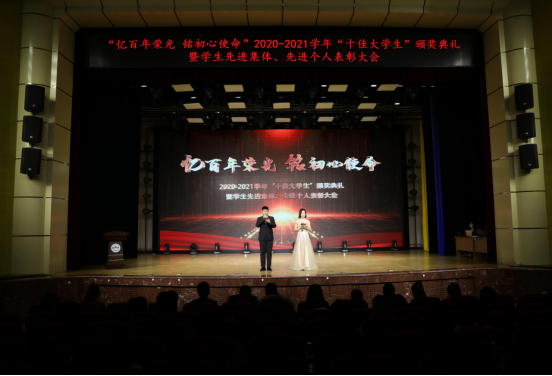 在慷慨激昂的《国歌》声中,大会拉开序幕,随后以视频形式展现了过去十年“十佳大学生”评选活动的精彩瞬间,以及历届“十佳大学生”代表在全国各地献给母校的祝福。