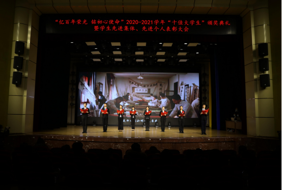 最后,“十佳大学生”以诗朗诵《青春》追忆中国共产党百年历程,引起在场学生齐呼“强国有我”的高亢誓言。