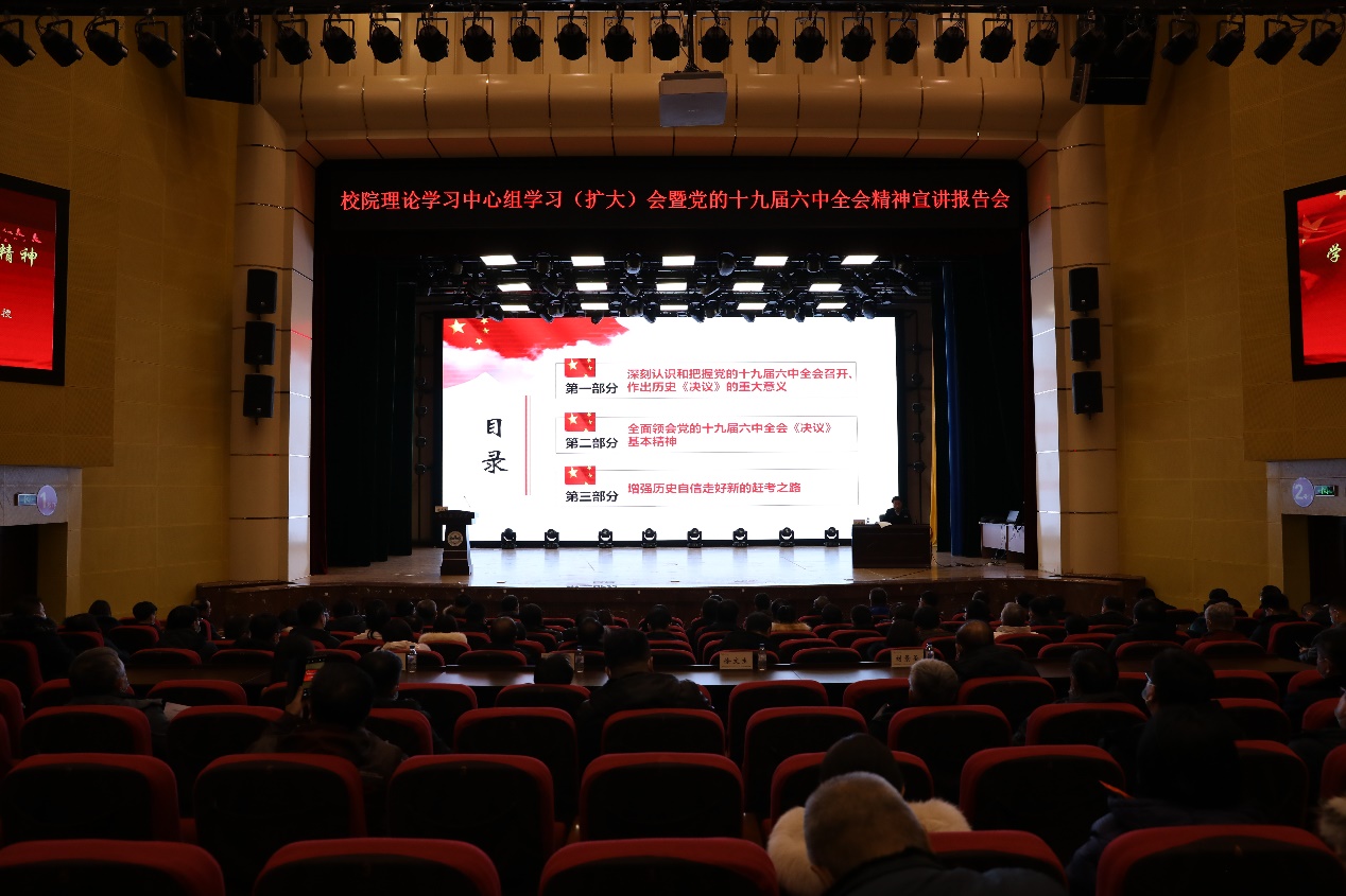 为深入学习贯彻党的十九届六中全会精神,扎实推动党史学习教育持续深入开展,12月20日,学校在鲲鹏学生文化活动中心召开校院理论学习中心组学习扩大会暨党的十九届六中全会精神宣讲报告会。校党委副书记徐文生主持会议。校党委副书记毛彦军、副校长刘景圣、校纪委书记王宏出席会议。